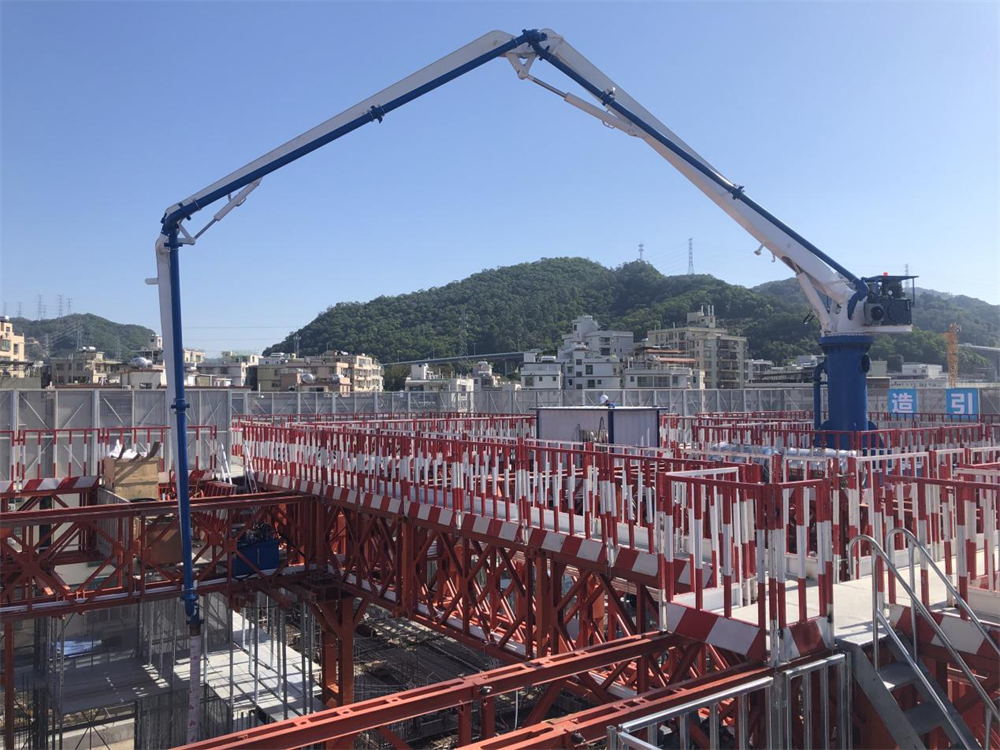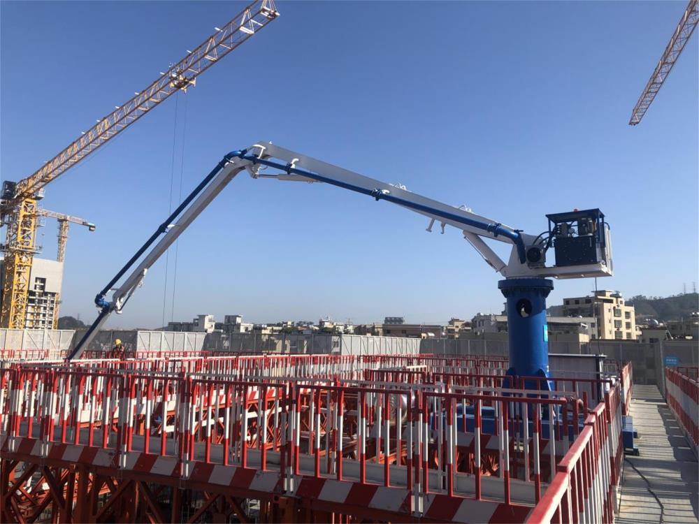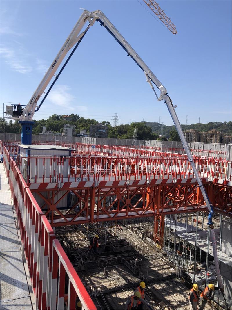 模架式液壓混凝土布料機自帶鋼平臺底座,與爬模架體連接傳遞施工載荷,無需自帶動力系統(tǒng),爬模爬升時帶動其爬升。其中HGY21模架式液壓混凝土布料機于2021年11月成功應(yīng)用在使用“住宅造樓機”的裝配式建筑領(lǐng)域(中建三局承建的廣州大源村項目)。